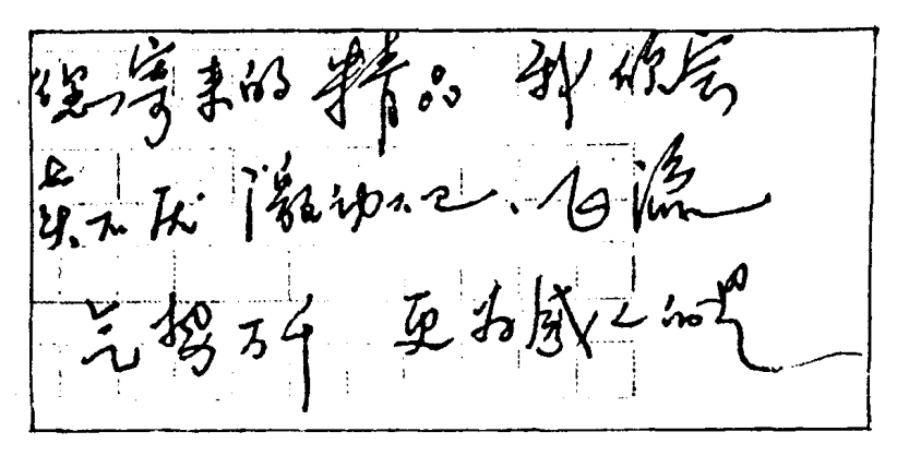字体右倾,运笔坚定有力,起落快速,字距较紧,字行逐渐上偏;横竖画有力而长大;如在原稿纸上写,几乎都把字写在格子的右半部:签名时朝右上偏,而收尾的笔画呈流转的长曲线。